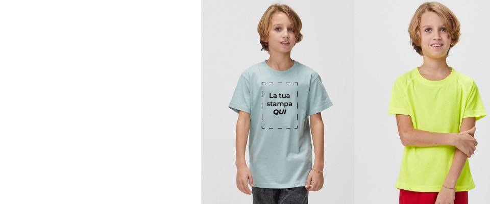 Vestibilità Bambino: tagli studiati per il movimento, spalle e collo rinforzati; modelli regular o leggermente sagomati a seconda della taglia.