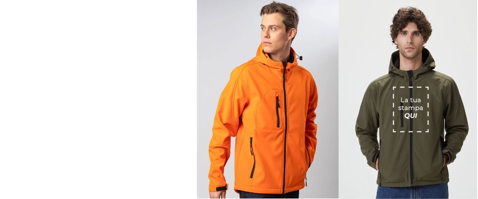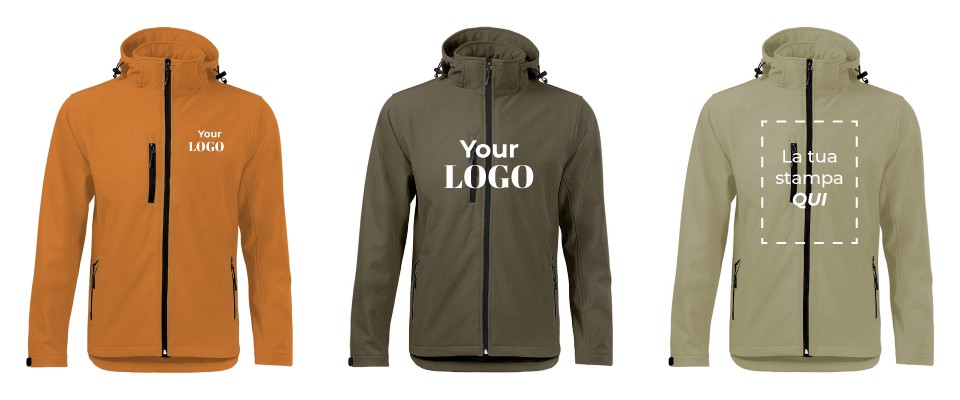 Posso ordinarla neutra? Certamente: la Hooded Softshell Black Spider è disponibile anche senza personalizzazione, pronta per utilizzo immediato o successive personalizzazioni.
