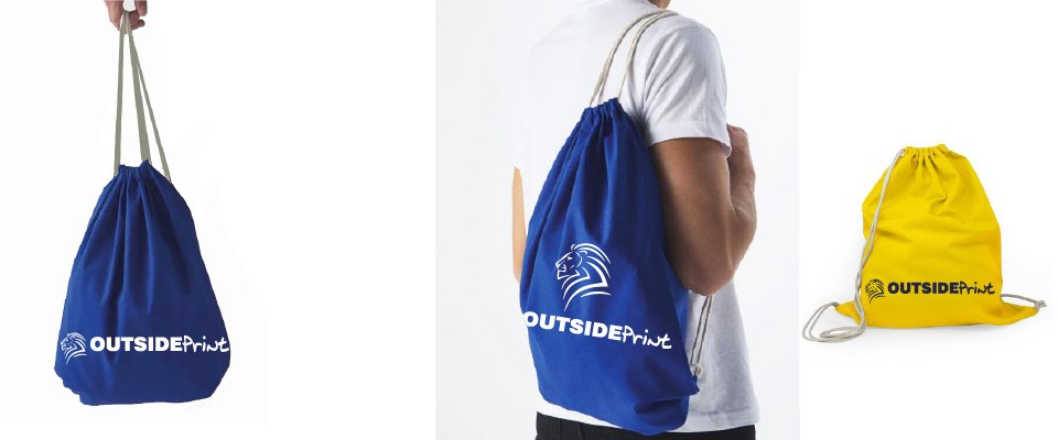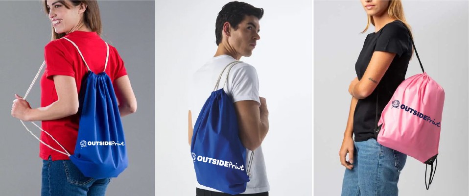 Costruzione: chiusura con cordoncino, spallacci in corda per portabilità comoda, fondo rinforzato e superficie liscia perfetta per la stampa.
