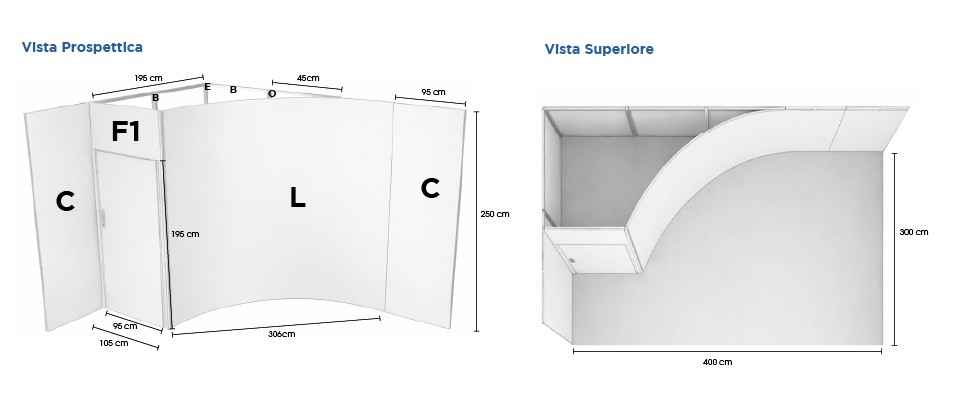 Gli stand personalizzati sono realizzati tramite moduli strutturali componibili, Per questo motivo non è previsto un template grafico unico predefinito. In fondo alla pagina sono disponibili la scheda tecnica completa, le misure precise e su “Specifiche PreStampa” dettagliate dei singoli moduli delle pareti, indispensabili per adattare correttamente l’immagine grafica in fase d’ordine.