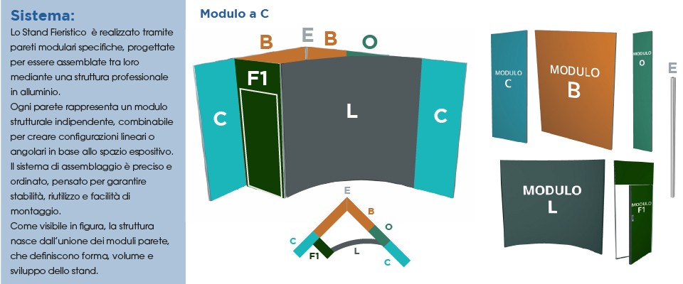 Questa flessibilità consente di adattare lo stand a diverse posizioni all’interno del padiglione fieristico.