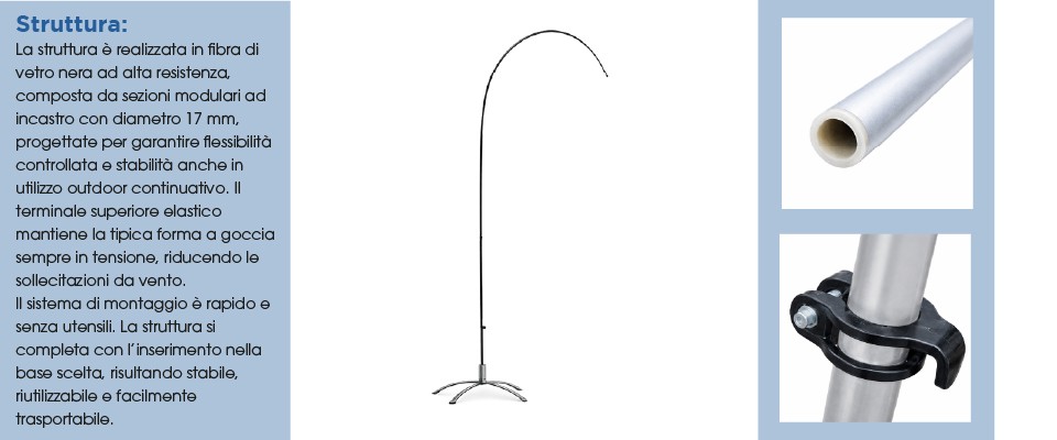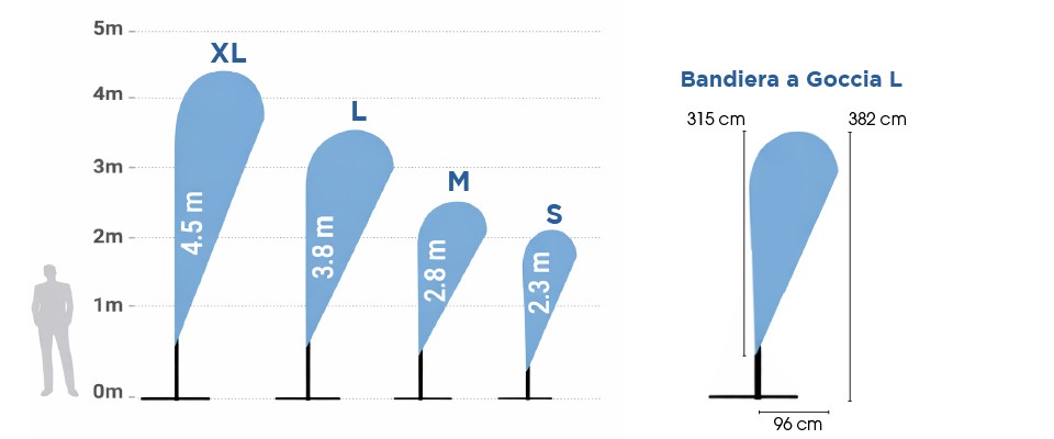 La Bandiera a Goccia L è la soluzione ideale per utilizzo outdoor professionale quando serve massima visibilità a distanza. Con un’altezza totale di 382 cm, questo formato garantisce un impatto visivo dominante e una presenza scenica importante, perfetta per spazi aperti, aree ad alto traffico e contesti promozionali di grande affluenza.