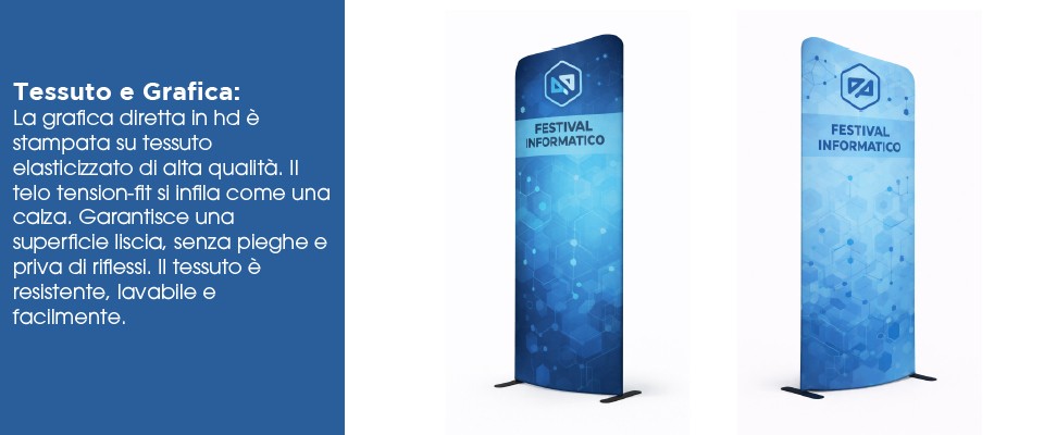 Il telo grafico del Fondale a Tubolare Curvo è realizzato in tessuto elasticizzato professionale, studiato per adattarsi perfettamente alla forma bombata della struttura.