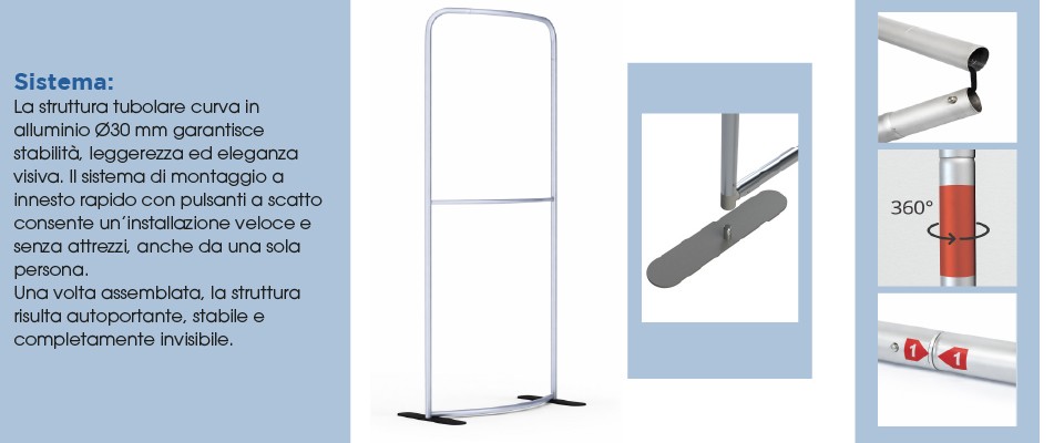 La struttura del Fondale a Tubolare Curvo è realizzata in alluminio anodizzato ad alta resistenza, progettato per un utilizzo fieristico intensivo e ripetuto.