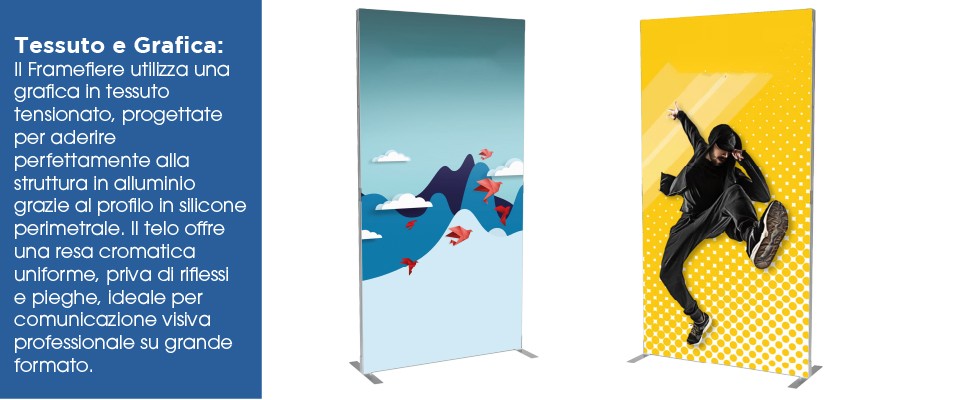 La grafica del Frame Fiere 120×250 è realizzata in tessuto tensionato disponibile nelle versioni Classic o Premium, entrambe progettate per garantire: