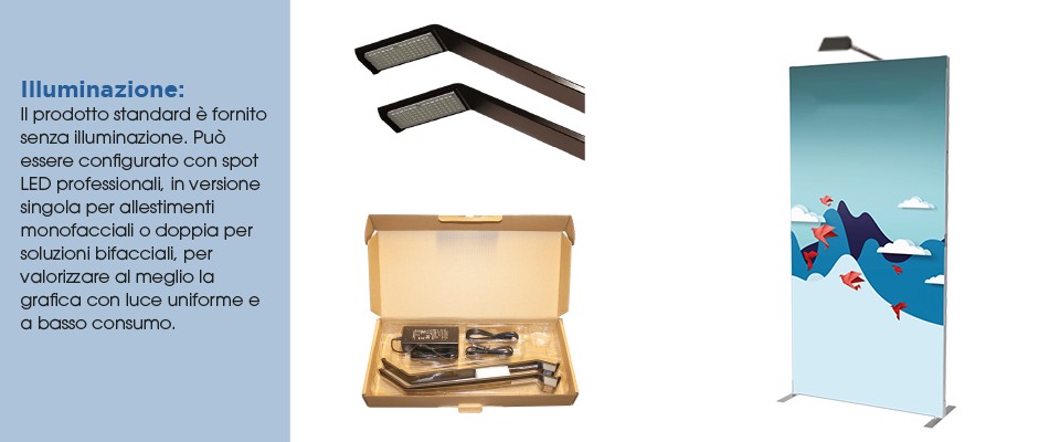 1 faretto LED Exhibition consigliato per configurazioni monofacciali, per valorizzare la grafica in modo uniforme e mirato.