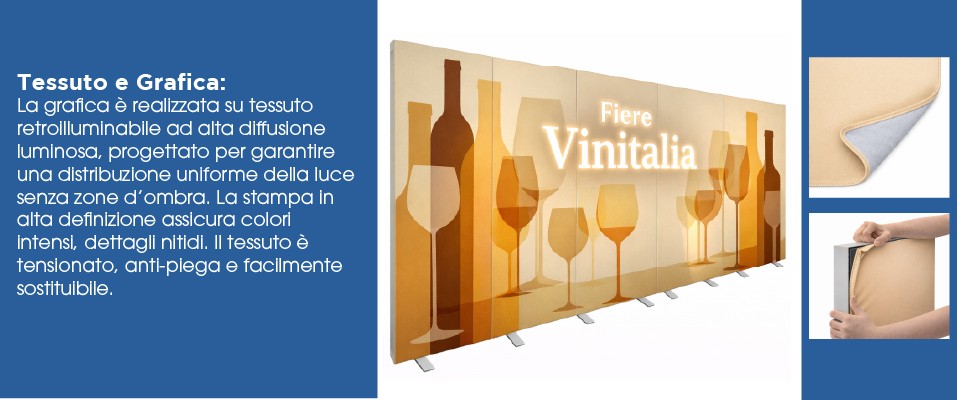 La grafica del Frame Fiere Luminoso è realizzata in tessuto specifico per retroilluminazione, progettato per garantire: