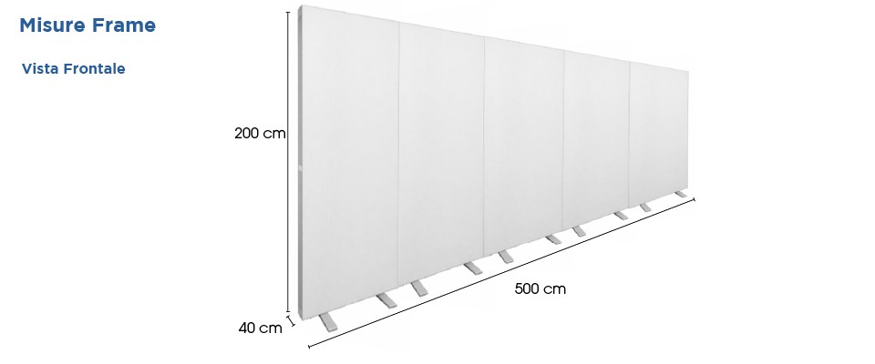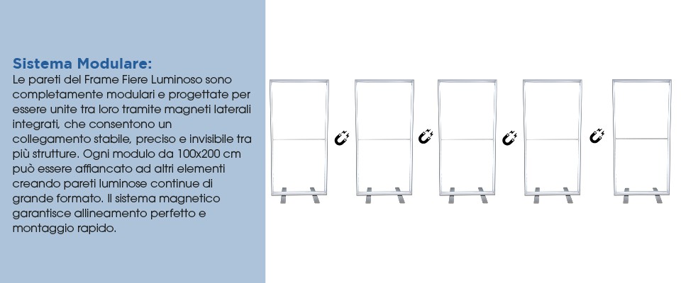 Il Frame Fiere Luminoso 500x200 è composto da cinque strutture separate da 100x200 cm che si uniscono tra loro tramite magneti laterali integrati, creando un’unica parete luminosa continua di grande formato.