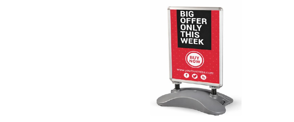 Il cavalletto bifacciale da esterno, disponibile in 3 dimensioni, è l'espositore perfetto per negozi, fiere, eventi, centri commerciali, uffici pubblici e aree ad alto passaggio.