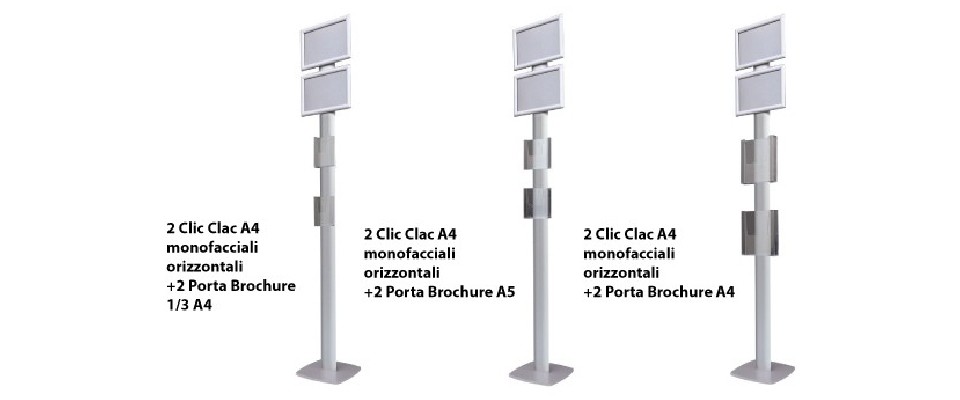 Disponibile in tre configurazioni diverse, questo espositore è dotato di cornici clic-clac A4 orizzontali per una facile sostituzione dei messaggi, e di porta brochure A4 o A5 orizzontali, perfetti per distribuire materiale informativo. L’altezza complessiva della struttura è di 190 cm, dimensione ottimale per garantire visibilità anche in ambienti affollati.