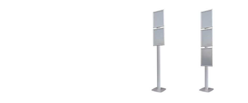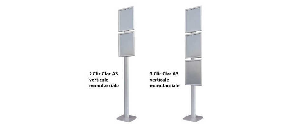 Dotato di cornici clic-clac formato A3 verticale, consente una sostituzione rapida dei contenuti senza necessità di attrezzi. Le cornici sono disposte in modo modulare per assicurare una lettura immediata e ordinata delle informazioni. Disponibile in due varianti di configurazione, è ideale per esigenze espositive diverse: dalla comunicazione interna alle presentazioni promozionali.