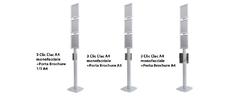 Equipped with multiple vertical A4 snap frames (clic-clac system) and integrated brochure holders (A4 or A5), it allows for quick updates of promotional materials, flyers, or information sheets. The structure is available in three different configurations to suit any need.