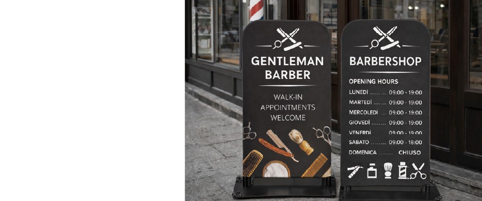 La forma verticale dinamica consente una lettura chiara e progressiva del messaggio, rendendo il prodotto perfetto per ambienti commerciali ad alta affluenza come fiere, showroom, ingressi, aree hospitality e spazi retail.