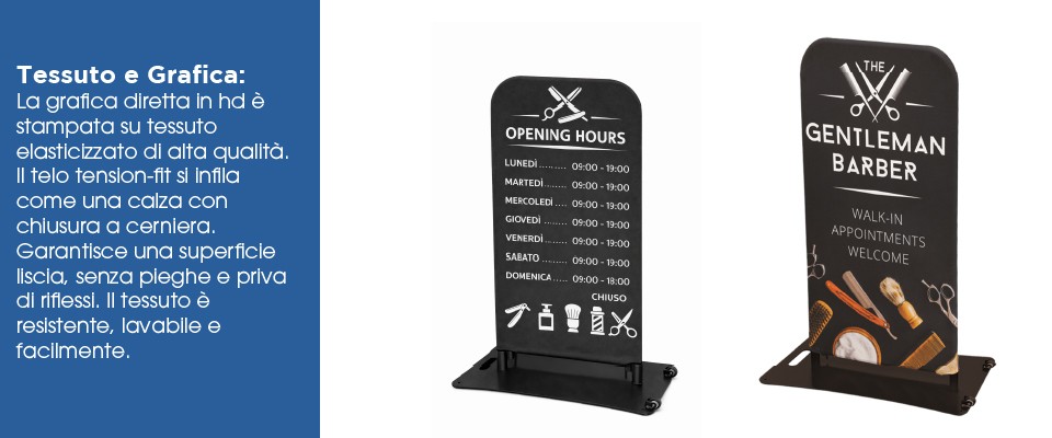 La grafica è realizzata su tessuto elasticizzato Ustretch (antipiega), specifico per sistemi espositivi professionali.