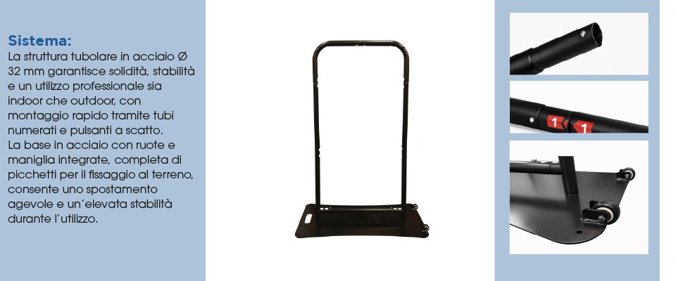 Il telo viene infilato sulla struttura come una calza e chiuso con zip inferiore nascosta, per una resa estetica pulita e professionale.