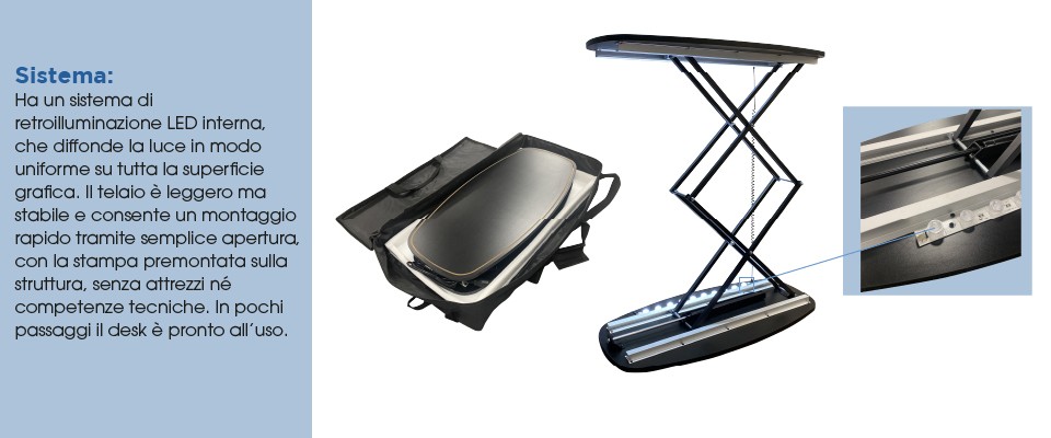 Uno dei grandi vantaggi del Desk Luminoso Pop Up è la sua eccellente trasportabilità.