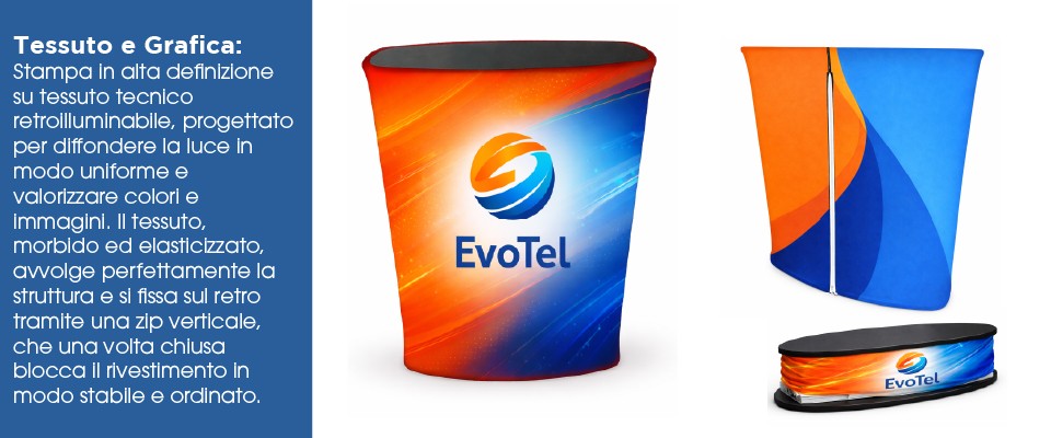 La grafica in tessuto retroilluminabile permette una personalizzazione completa del Desk Luminoso Pop Up.