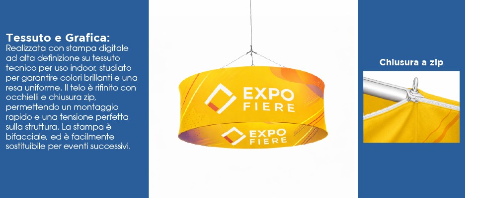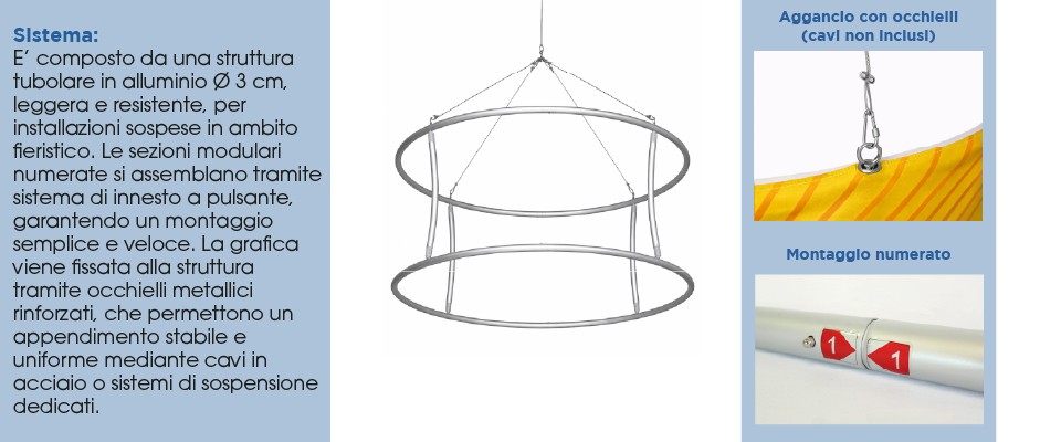 • Appendimento Circolare: E' una soluzione sospesa professionale per fiere ed eventi indoor, progettata per garantire massima visibilità a 360° sopra stand e aree espositive. La struttura tubolare in alluminio si monta rapidamente grazie alle sezioni numerate con innesto a pulsante, mentre la grafica su tessuto stampato si fissa con occhielli e chiusura zip, ed è disponibile mono o bifacciale, anche con cielino. Disponibile in 4 misure, si adatta a diverse superfici e contesti espositivi. Prodotto Ignifugo