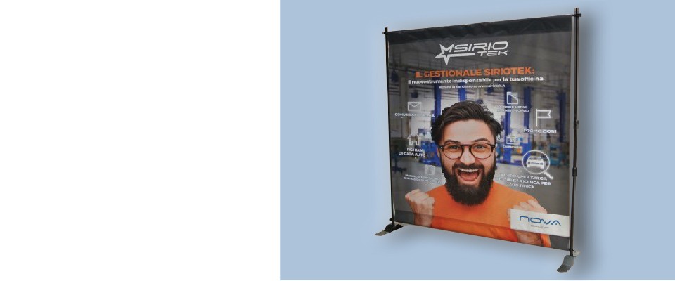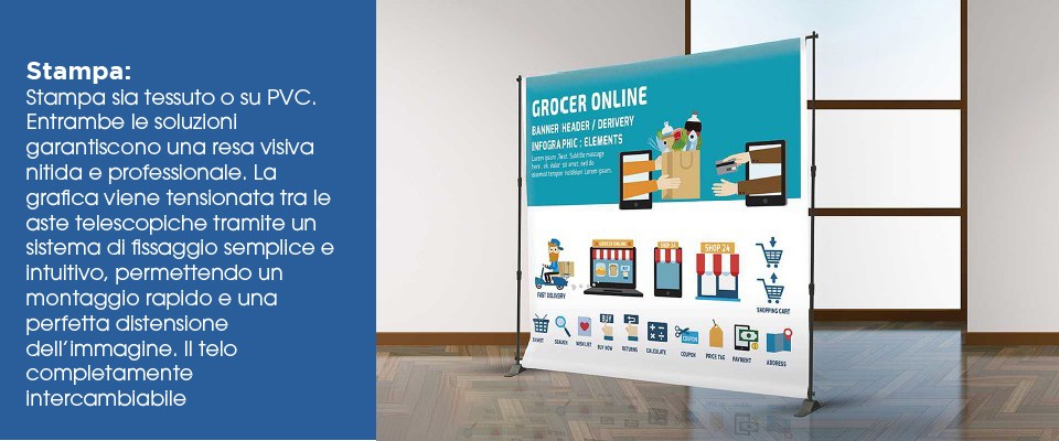 La soluzione completa: struttura telescopica regolabile + stampa personalizzata su tessuto o PVC ad alta definizione. Perfetto per fiere, eventi e allestimenti professionali.