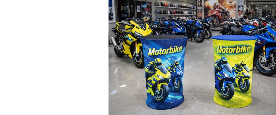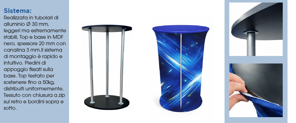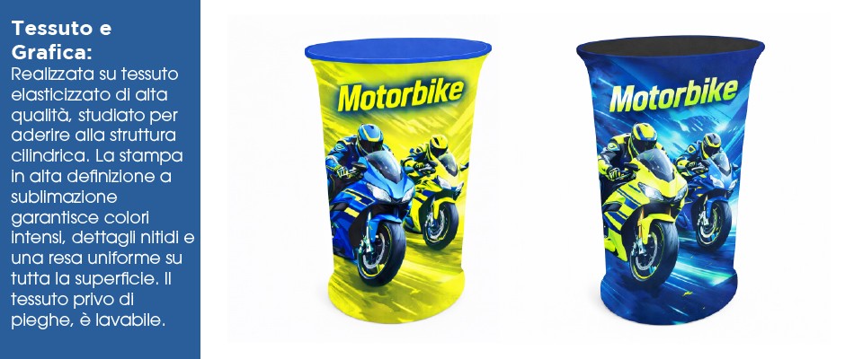 Grazie alla sua forma cilindrica elegante, alla struttura in tubolari di alluminio e alla copertura grafica completa in tessuto, questo banco promozionale è pensato per offrire una resa estetica di grande impatto, un’elevata praticità operativa e una comunicazione visiva continua e avvolgente lungo tutta la superficie.