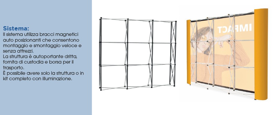 Struttura pop-up con apertura/chiusura magnetica, profili estensibili e connettori rinforzati.