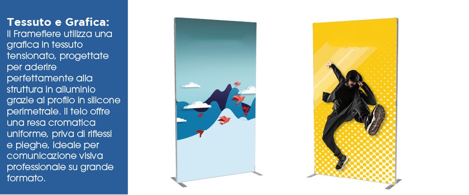 La grafica del FrameFiere 100x200 è realizzata in tessuto tensionato per garantire: