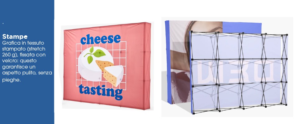 La grafica è realizzata su tessuto elasticizzato anti-piega (stretch), che si fissa alla struttura tramite Velcro (maschio) — su richiesta. Questo consente di mantenere la grafica tesa e uniforme, senza pieghe, con un effetto visivo professionale.