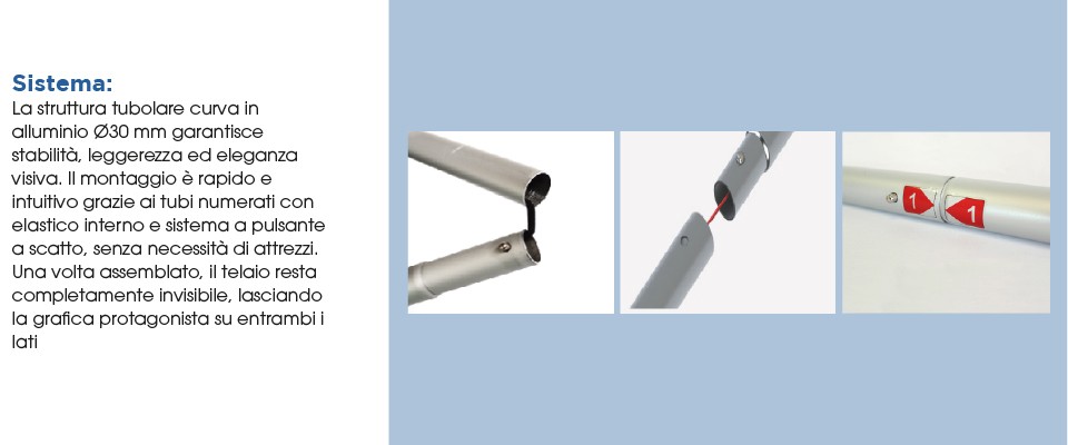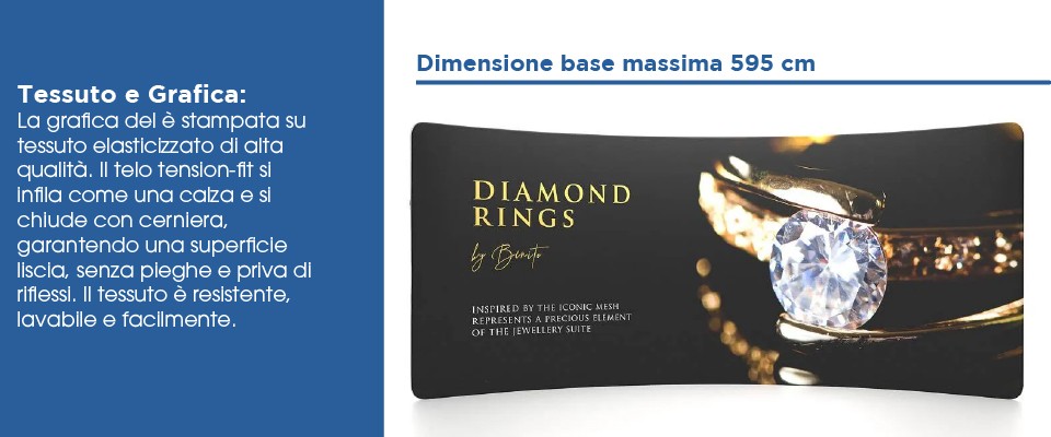 Soluzione completa pronta all’uso con struttura tubolare curva e grafica in tessuto elasticizzato stampata HD.