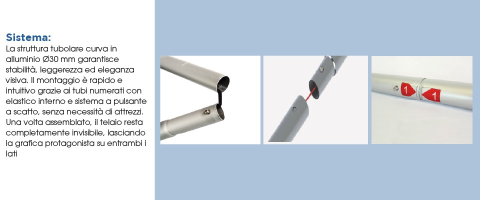 La struttura del fondale è realizzata con tubi in alluminio Ø30 mm, progettati per garantire: