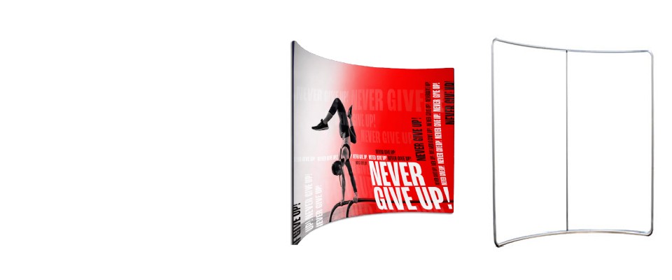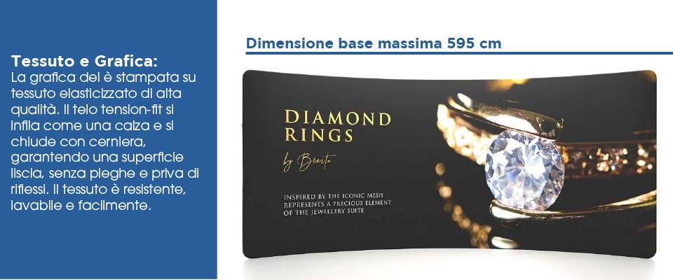 Soluzione completa pronta all’uso con struttura tubolare curva e grafica in tessuto elasticizzato stampata HD.