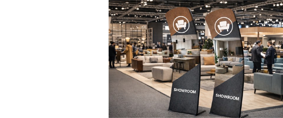 Le proporzioni verticali garantiscono una comunicazione efficace e visibile anche a distanza, mentre l’ingombro contenuto consente l’installazione anche in spazi espositivi ridotti.