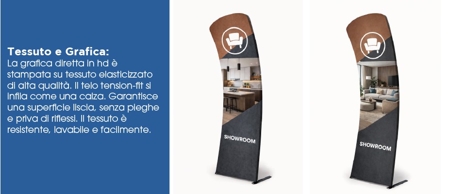 Il telo grafico del Fondale a Tubolare Dinamico è realizzato in tessuto elasticizzato tension-fit, studiato appositamente per sistemi espositivi professionali.