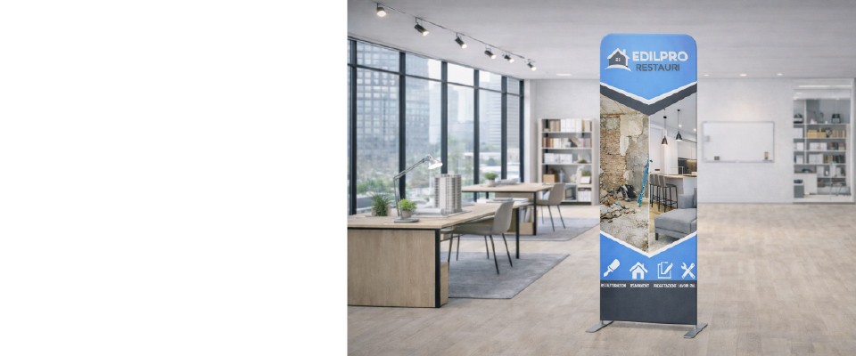 Il Fondale Pubblicitario Economico è una soluzione espositiva professionale pensata per la comunicazione visiva verticale in contesti fieristici, eventi aziendali, showroom, retail e ambienti indoor professionali.