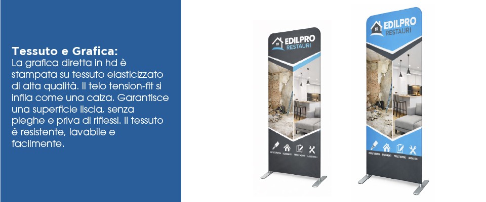 Il telo grafico del Fondale Pubblicitario Economico è realizzato in tessuto elasticizzato specifico per sistemi tension fabric.