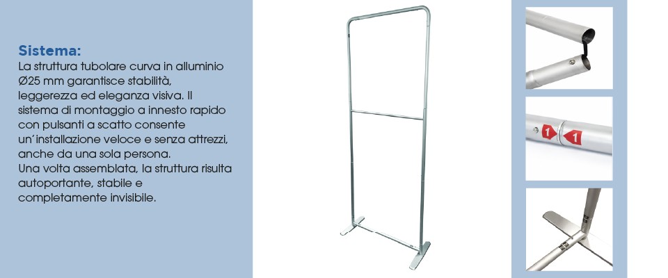 La struttura del Fondale Pubblicitario Economico è realizzata con tubolari in alluminio Ø 25 mm, studiati per garantire leggerezza, stabilità e facilità di montaggio.