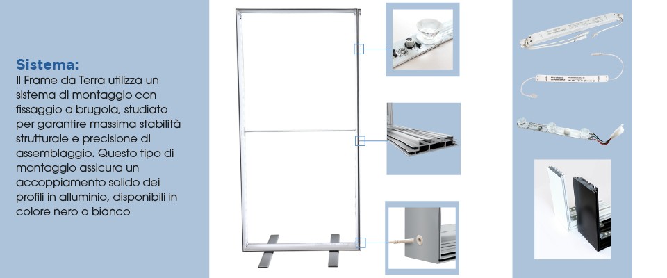Questa architettura rende il frame ideale per installazioni permanenti o temporanee in fiere, showroom e ambienti commerciali.