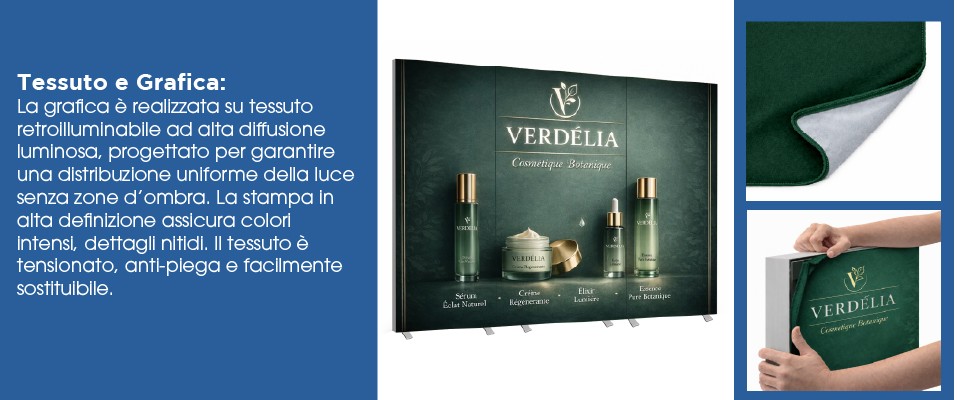 La struttura monoblocco preassemblata, abbinata alla grafica in tessuto retroilluminabile, garantisce un fondale estremamente stabile, uniforme e perfettamente illuminato su entrambi i lati. È la soluzione ideale per aziende, brand, agenzie e allestitori che ricercano visibilità immediata, affidabilità e semplicità operativa.