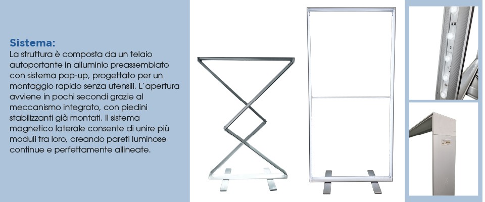 Soluzione completa pronta all’uso che include struttura luminosa, sistema LED preinstallato, grafica stampata su tessuto retroilluminabile e borsa imbottita per il trasporto.