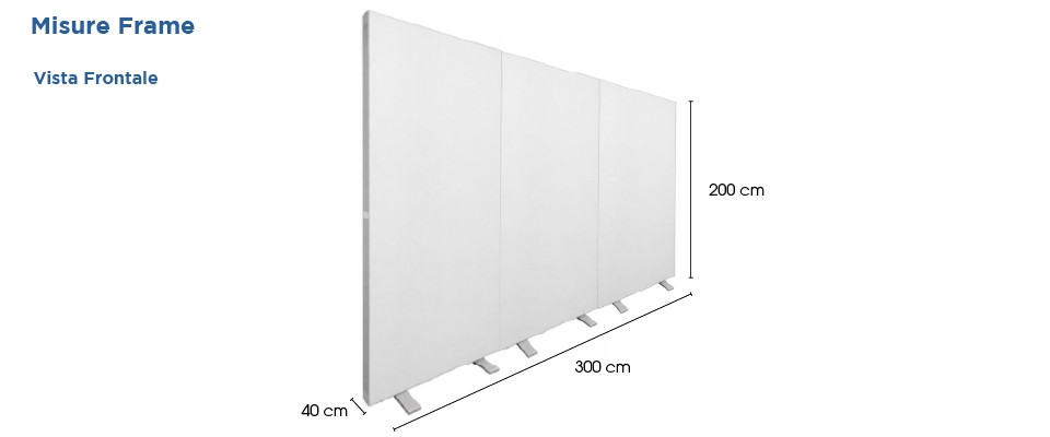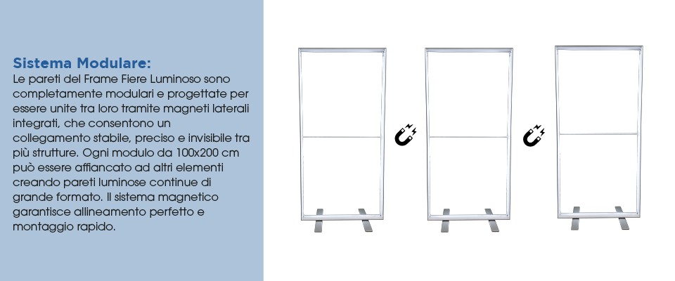Il Frame Fiere Luminoso 300x200 è composto da tre strutture separate da 100x200 cm che si uniscono tra loro tramite magneti laterali integrati, creando un’unica parete luminosa continua di grande formato.