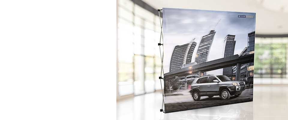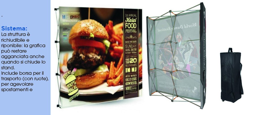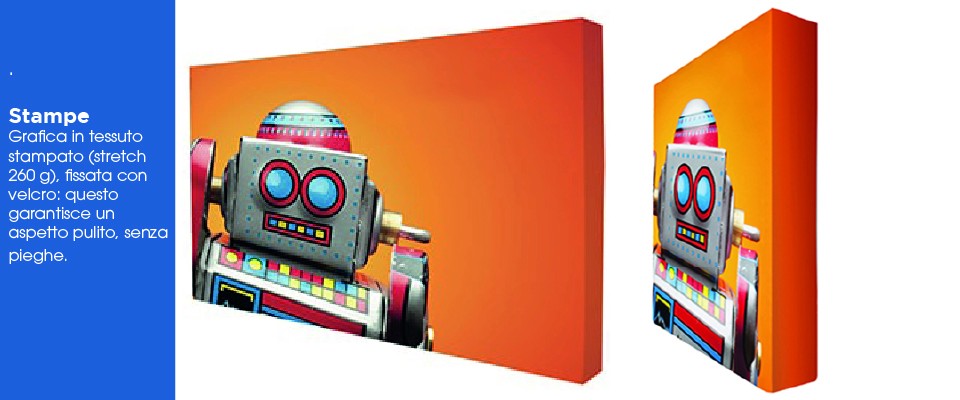 La grafica è realizzata su tessuto elasticizzato anti-piega (stretch), che si fissa alla struttura tramite Velcro (maschio) — su richiesta. Questo consente di mantenere la grafica tesa e uniforme, senza pieghe, con un effetto visivo professionale.