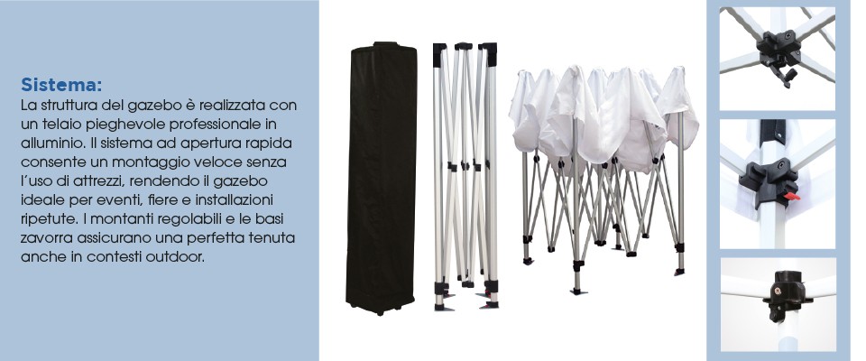 Questa architettura rende il gazebo ideale per installazioni temporanee ripetute e utilizzo intensivo durante l’anno.