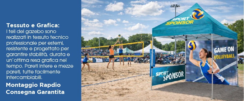 La grafica del Gazebo Personalizzato 3x3 è realizzata su tessuto tecnico specifico per utilizzo outdoor, progettato per garantire:
