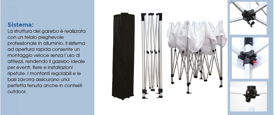 Questa architettura rende il gazebo ideale per installazioni temporanee ripetute e utilizzo intensivo durante l’anno.