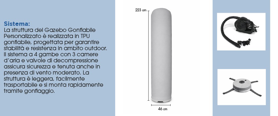 Il totem è realizzato con una struttura gonfiabile in PVC, progettata per offrire leggerezza, resistenza e facilità di utilizzo.