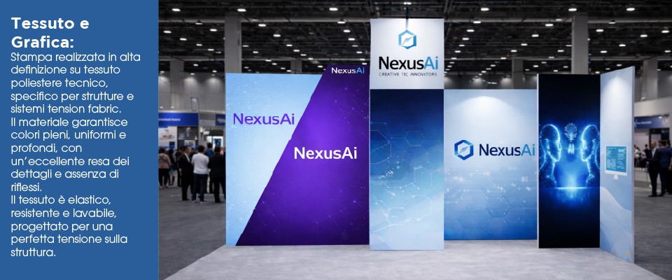 Il trapezio per stand è rivestito con grafica su tessuto professionale stampato, studiata per garantire una resa visiva uniforme e di alta qualità.