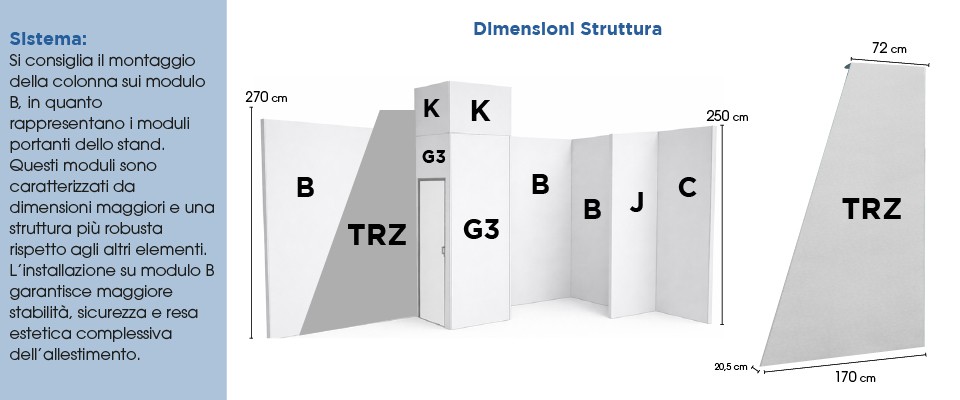 Il trapezio è progettato per offrire un equilibrio ottimale tra ingombro e impatto visivo, risultando efficace anche in spazi fieristici di metratura contenuta.